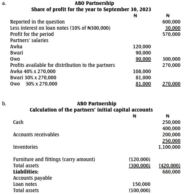 i. During the year, the partnership earned a profit of ₦600,000. Interest on the loan notes is 10% per annum.