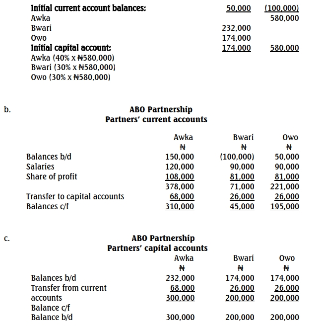ABO Partnership consists of three partners: Awka, Bwari, and Owo. The partnership agreement specifies that profits and losses are to be shared in the following manner: