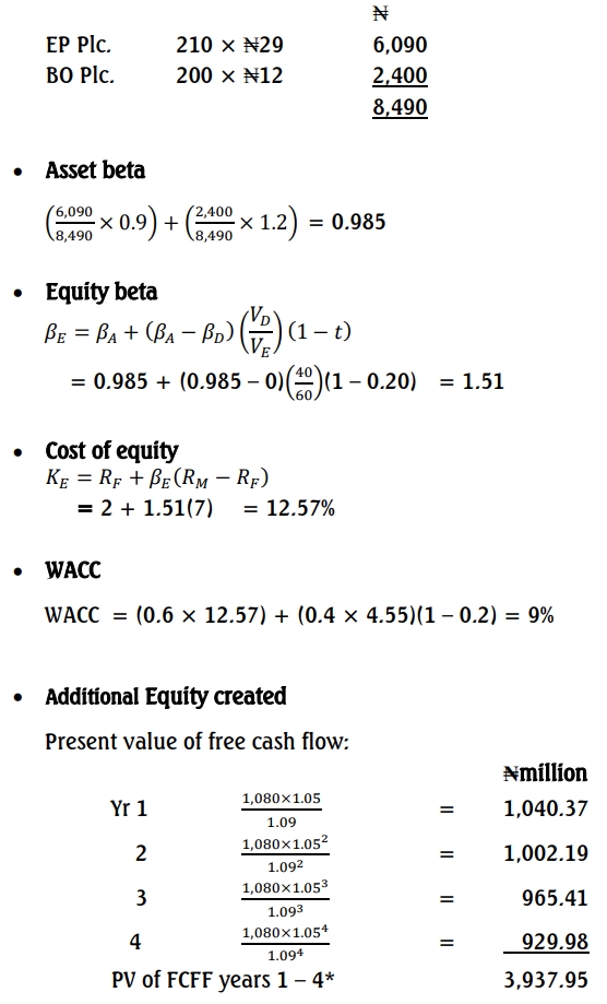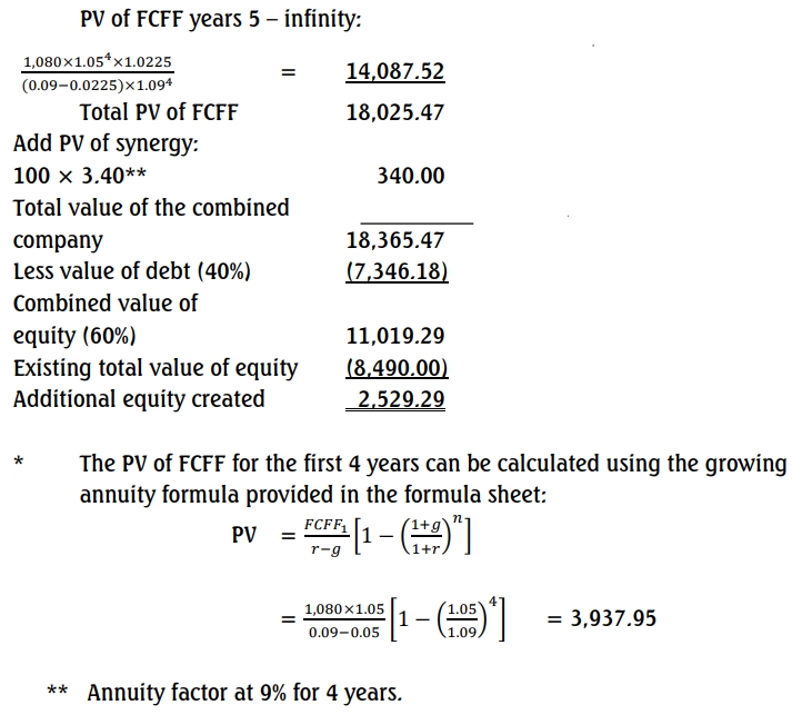 It is thought that combining the two companies will result in several benefits. It is estimated that combining the two companies will generate free cash flow to the firm (FCFF) of N1,080 million in current value terms, but these will increase by an annual growth rate of 5% for the next four years before reverting to an annual growth rate of 2.25% in perpetuity. In addition to this, combining the companies will result in cash synergy benefits of N100 million per year for the next four years. These synergy benefits are not subject to any inflationary increase, and no synergy benefits will occur after the fourth year.
