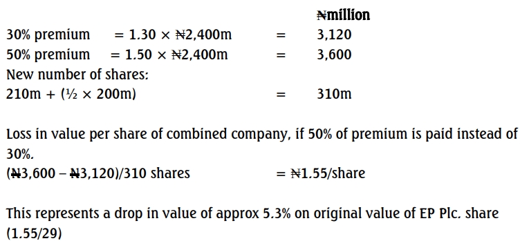 (b) Estimate the impact on EP Plc’s equity holders if the premium paid is increased to 50% from 30%. (5 Marks)