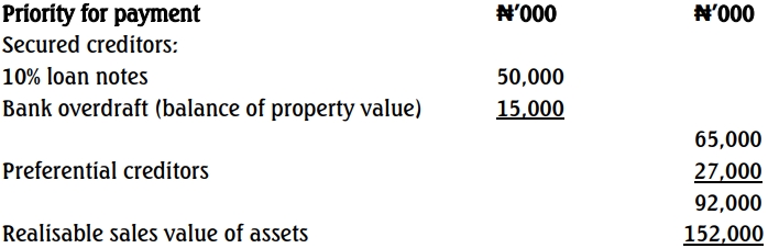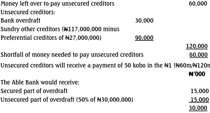 The proceeds from the freehold property would be used to repay the 10% loan notes of ₦50,000,000 (which has a first charge on the property) and the remaining ₦15,000,000 would be used to repay some of the overdraft (which has a second charge). This leaves ₦(45,000,000 – 15,000,000) = ₦30,000,000 of the overdraft as an unsecured creditor.