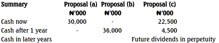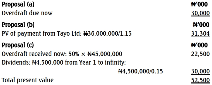 Proposal (c) offers, by far, the highest return, but it is perhaps the most risky option. If the reconstructed company fails to make the expected profits, the bank might receive only ₦22,500,000. On the other hand. If the reconstruction ends in success, the bank will make a „profit‟ on its current overdraft investments in Pinko Ltd. (which is only ₦45 million).