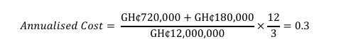 Assuming the company continues with its current purchase strategy of buying 100,000 units at a purchase price of GH¢120, it would need to borrow GH¢12,000,000. The annualized cost of the loan, therefore, would be 30%: