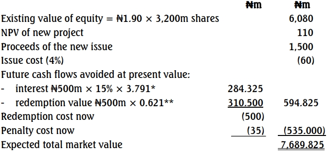 The directors of Kenny plc wish to make an equity issue to finance an ₦800 million expansion scheme, with an expected net present value of ₦110 million. It is also to re-finance an existing 15% term loan of ₦500 million and pay off a penalty of ₦35 million for early redemption of the loan.