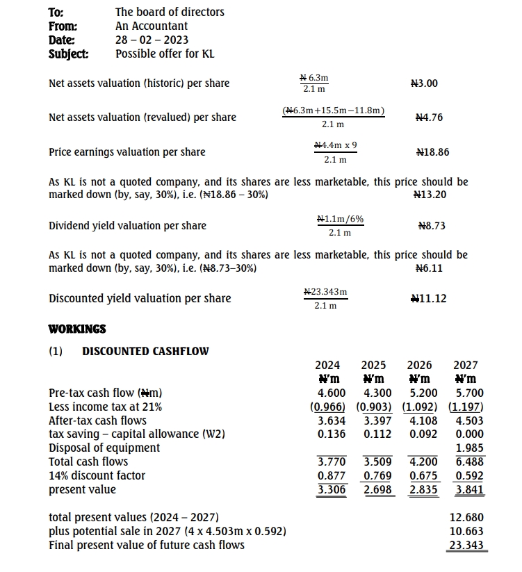 You are employed by Bolade Plc (BP), a very large printing firm with retail outlets across Nigeria. Its board is considering making an offer to buy 100% of the shares of Kenny Ltd (KL), a competitor of Bolade in Aba. KL’s financial year-end is 28 February, and its most recent financial statements are summarised below: