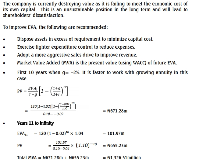 b. Irrespective of your answer in (a) above, assume the company’s current EVA is ₦120million and that this will decline annually by 2% for the next ten years and then increase by 4% per annum in perpetuity. Assume the following for this part only: