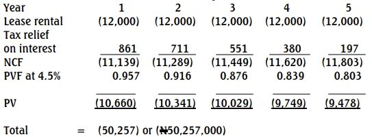 b. Advise, using present value method, whether Tamilore Limited should borrow to buy the machine or lease it. (12 Marks)