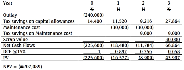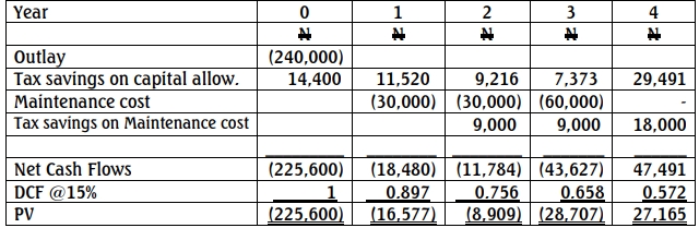 (iii) Maintenance costs are covered by the supplier in the first year. In the second and third years, maintenance costs average N30,000 annually. In the fourth year, they increase to N60,000. Maintenance costs are tax-allowable and payable on the first day of the accounting year.