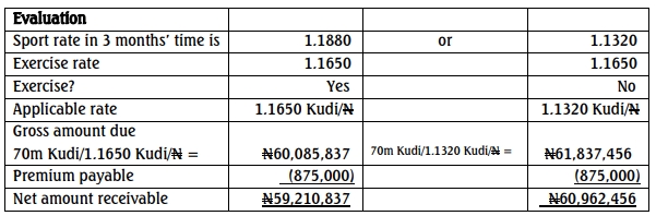(iii) Use an over-the-counter currency option on Kudi, available through Alpha Plc.’s bank. Current premiums at an exercise price of 1.1650 Kudi/N are N1.10 per 100 Kudi for a call option and N1.25 per 100 Kudi for a put option.