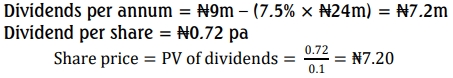 - Issuing 7.5% irredeemable bonds at par with interest payable annually in arrears. For this option, interest would be paid out of the ₦9 million otherwise allocated to dividends.