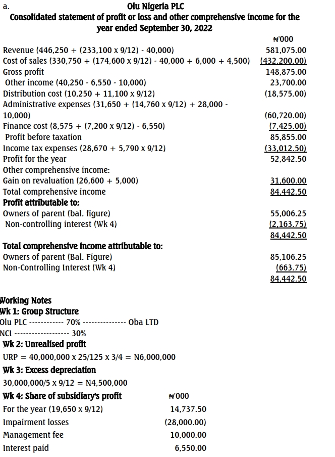 a. Prepare the consolidated statement of profit or loss and other comprehensive income for Olu Group for the year ended September 30, 2022. (12 Marks)