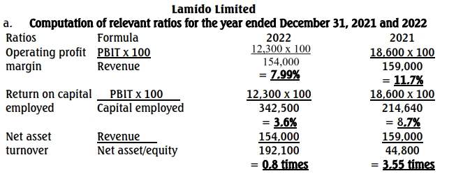 b. Comment on the performance and position of Lamido Limited for the year ended December 31, 2022, and highlight any issues Lamido Limited should consider in the near future. (14 Marks)