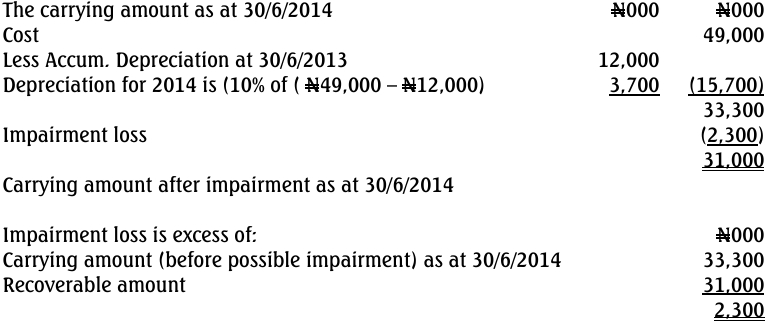 - Recoverable amount = higher of fair value less cost to sell (N26,000,000) and value in use (N31,000,000).