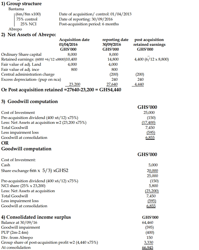 - Abrepo Ltd paid a dividend of GH¢400,000 on 30 September 2016. The profit and dividend of Abrepo Ltd are deemed to accrue evenly throughout the year. Abrepo Ltd’s retained earnings of GH¢8.8 million for the year to 30 September 2016 as shown in its statement of financial position are after the deduction of the dividend. Bantama Ltd’s policy is to credit to income only those dividends received from post-acquisition profits. Bantama Ltd has not yet accounted for the dividend from Abrepo Ltd. The cheque has been received but not banked.