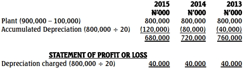 Prospect Nigeria Plc completed the construction of plant on January 1, 2013 at a total cost of N900million. The plant has an expected useful life of 20 years and is depreciated on a straight line basis with no residual value.
