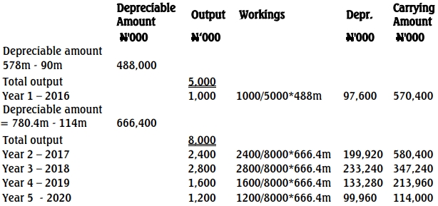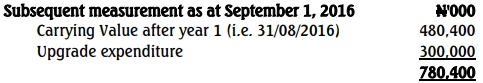 On September 1, 2016, NNL decided to upgrade the machine by adding new major components at a cost of N300,000,000. As a result of the upgrade, the remaining useful life was increased to 8,000,000 units and the residual value was revised to N114,000,000.
