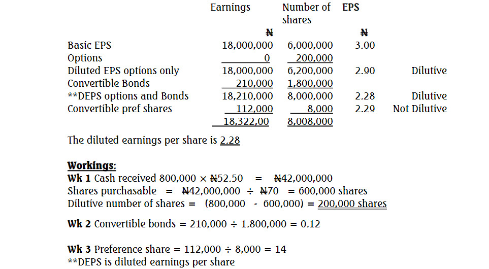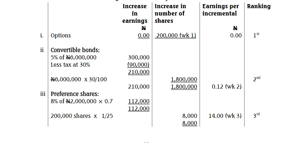 iii. 200,000 8% convertible preference shares at N10 per share. Each preference share is convertible in year 2024 at the rate of one ordinary share for every 25 preference shares held. The Company income tax rate is 30%. Assume that all the options are exercised.