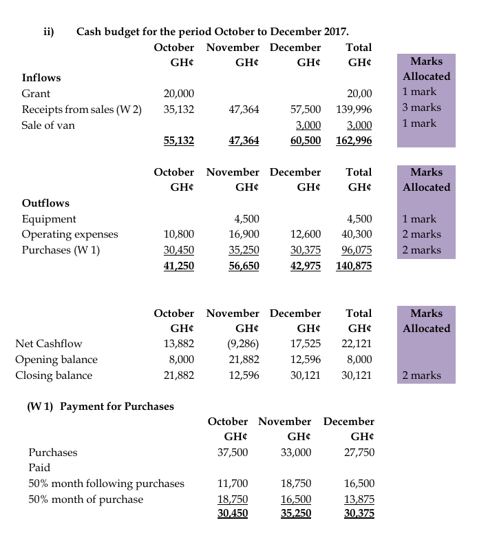 • Equipment costing GH¢4,500 will be purchased and paid for in November 2017. The equipment will be depreciated on a straight line basis over three years.