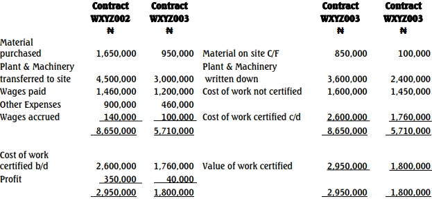 Wazobia is a construction company currently undertaking two separate contracts. From the following information relating to the just-concluded financial year and other data extracted from the records of the company, you are required to prepare accounts for the two contracts using a columnar format: