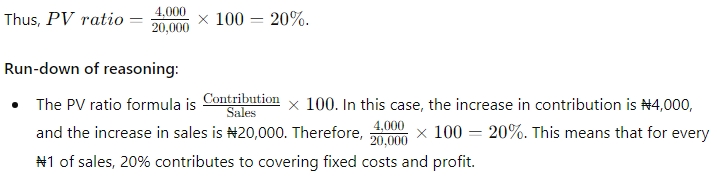 The answer is “D. 20%” because the Profit Volume (PV) ratio is calculated as the increase in contribution divided by the increase in sales, multiplied by 100. The increase in sales is ₦100,000 – ₦80,000 = ₦20,000, and the increase in contribution is ₦4,000.