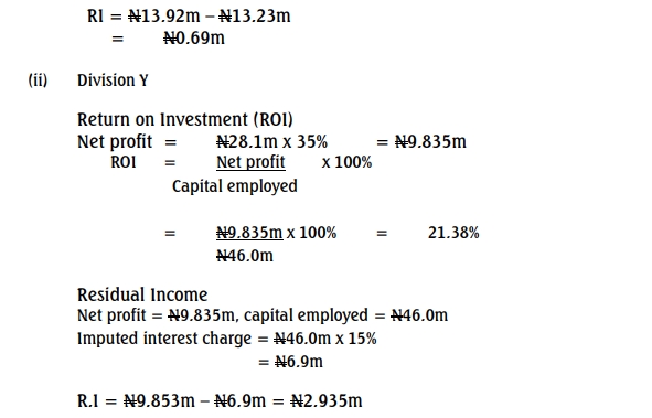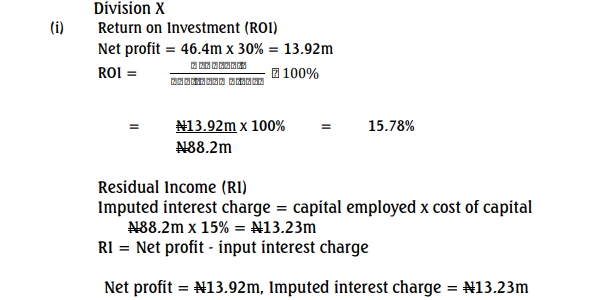 - Residual Income (RI): Division X has a lower RI (₦0.69 million) compared to Division Y (₦2.935 million). Since RI considers the cost of capital, it provides a better indication of the value added by each division. In this case, both divisions generate positive RIs, indicating value addition, but Division Y performs better.
