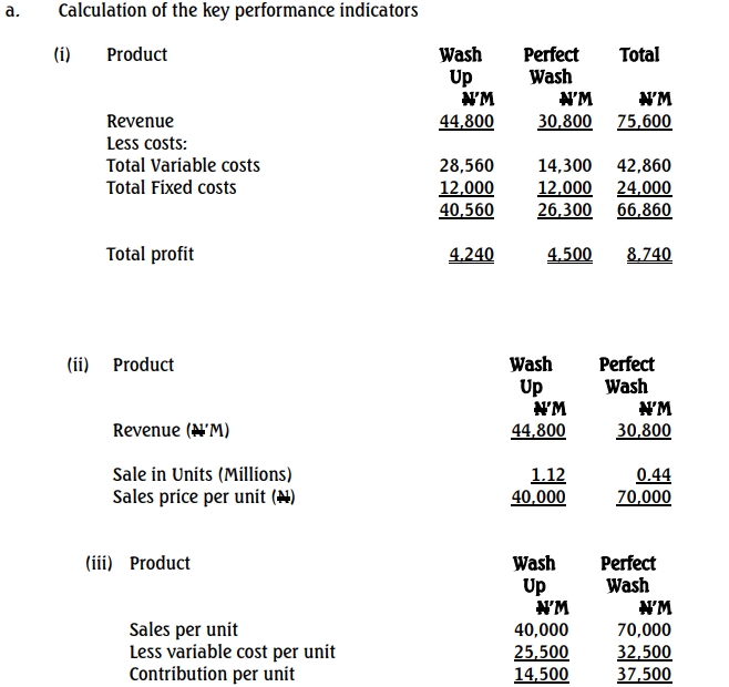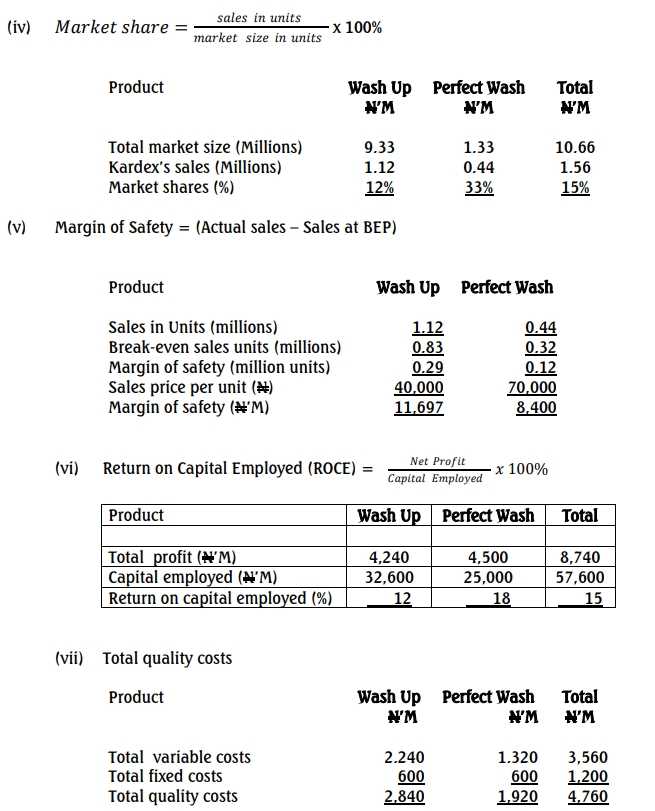 - Total profit, average sales price per unit, contribution per unit, market share, margin of safety, return on capital employed (ROCE), and total quality costs.