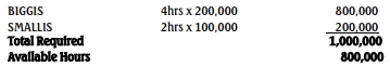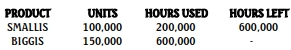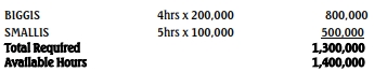Machine time needed to produce 200,000 units of Biggis and 100,000 units of Smallis