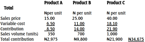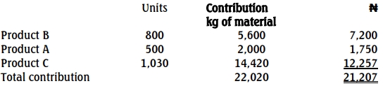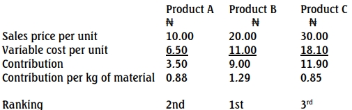 The general fixed costs are budgeted at ₦20,000 for the year, with no specific fixed costs expected per product. Additionally, all three products use the same direct material, with a limited supply of 22,020 kgs available for the budget year.