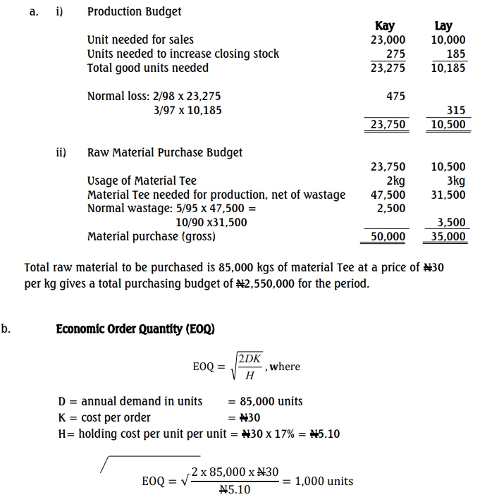 Eko Limited is a small manufacturing company producing two high-quality products called ‘Kay’ and ‘Lay’. Both products use a raw material Tee (costing ₦30 per kg) in their manufacture. The Directors are reviewing the company’s stock management policies for the forthcoming year as part of the annual budget preparation cycle.