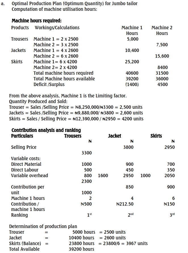 a. Determine the optimal production plan which Jumbo Tailors Nigeria Limited should adopt. (12 Marks)
