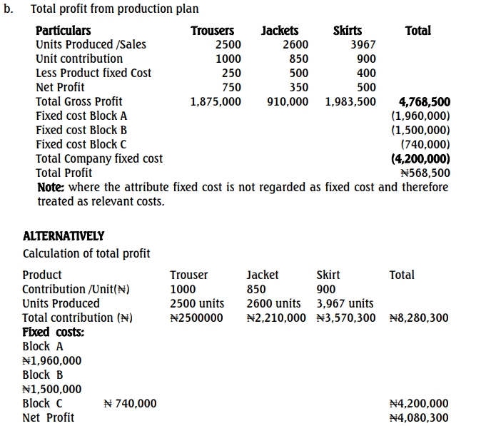 b. Calculate the total profit that would be made if the production plan in (a) above is adopted. (3 Marks)