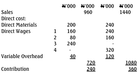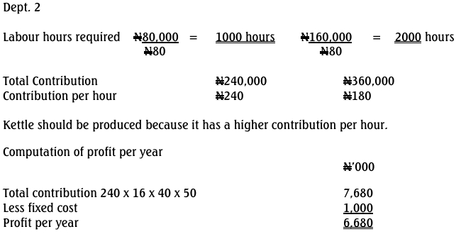 Paly Limited, a cottage manufacturer of aluminium products, specialises in producing kettles and cooking pots with annual sales value of N960,000 and N1,440,000 respectively.