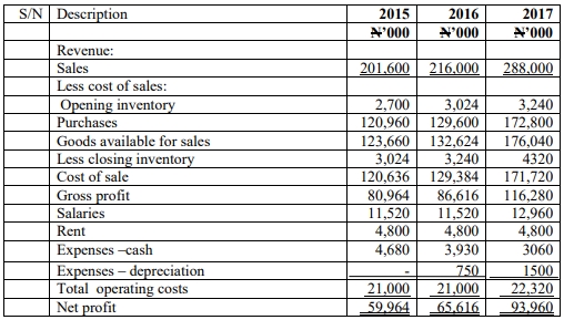 Year Monthly Sales (N’000) Monthly Salaries (N’000) Monthly Rent (N’000) Monthly Expenses (N’000)