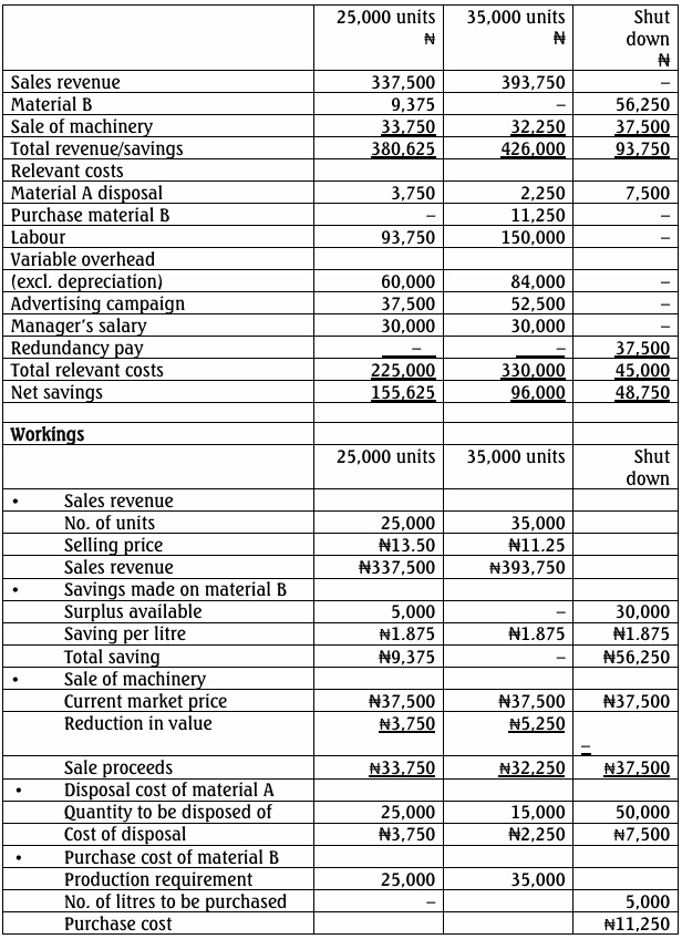 The management has therefore set up a committee of three, the factory manager, the marketing manager, and the management accountant to analyze the situation and come up with a report on what they felt the management should do. The marketing manager has submitted two proposals to the committee. These are: