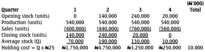 • The company incurs a holding cost (based on average inventory) of N25 per unit per quarter for each item that is held in inventory.