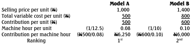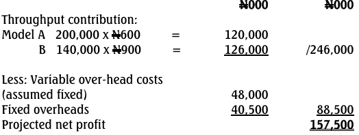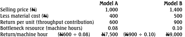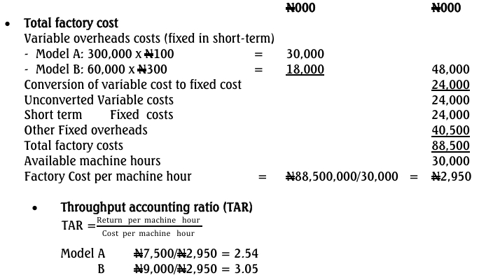 b. Calculate the throughput accounting ratio for each model and briefly discuss when a product is worth producing under throughput accounting principles. Assume that the variable overhead cost, amounting to N24 million for the chosen product mix in part (a), is fixed in the short term. (7 Marks)