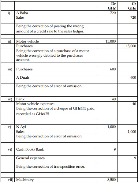 After the extraction of the above balances, the following errors and omissions were discovered: i) A sale on credit to Ali Baba of GHȼ800 had been entered in the Sales Journal as GHȼ80 and had also been posted to the Sales Ledger at the same amount. ii) A new Motor Vehicle costing GHȼ15,000 bought during the year had been debited to the Purchases Account. iii) Purchase of goods on credit from Agyemang Duah, amounting to GHȼ600, had been omitted from the books. iv) A cheque for GHȼ435 paid for Motor Vehicle expenses was recorded in the Cash Book and the Motor Vehicle Expenses Account as GHȼ475. v) Sales of goods on credit to Nii Ayi, amounting to GHȼ1,000, had been omitted from the books. vi) A cheque for GHȼ689 paid for general expenses was recorded in the Cash Book and the General Expenses Account as GHȼ698. vii) The purchase of machinery for GHȼ8,500 had been debited to the Machinery Repairs Account.