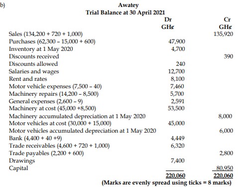 b) Prepare the Trial Balance of Awatey as at 30 April 2021 after adjusting for the errors and omissions.