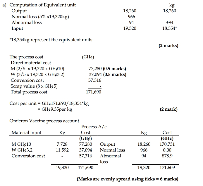 a) Adom Ltd manufactures Omicron vaccine for the treatment of COVID-19 in Africa. The manufacturing process uses two raw materials (M & W) which are mixed in the proportions (2:3). Materials are priced: M = GH¢10 per kg and W = GH¢3.2 per kg. Normal weight loss of 5% of material input is expected during the process, and material losses recorded in the manufacturing process have no saleable value. At the end of production, 18,260 kg of Omicron vaccine were manufactured from 19,320 kg of raw materials. Conversion costs in the period were GH¢57,316. There was no work in process at the beginning or end of the period.
