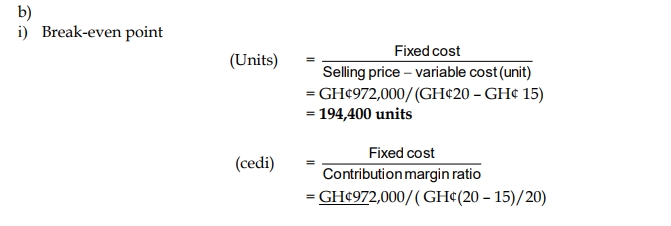i) Calculate the break-even point in units and Ghana cedis. (4 marks)