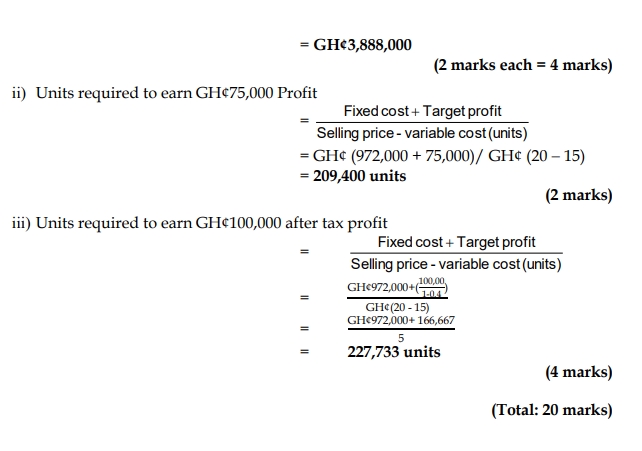 iii) Calculate the number of units that must be sold to earn an after-tax profit of GH¢100,000 if the income tax rate is 40%. (4 marks)