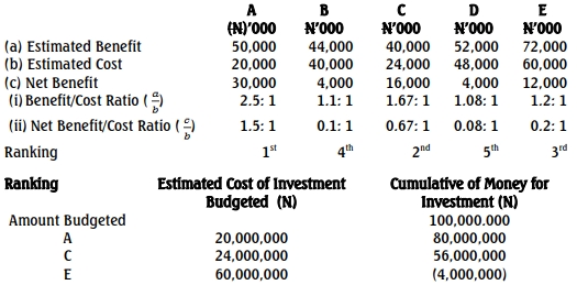 The following estimated costs and benefits relate to FIVE different divisible projects of Eleweran Local Government. The local government has budgeted the sum of N100,000,000 to undertake the following projects: