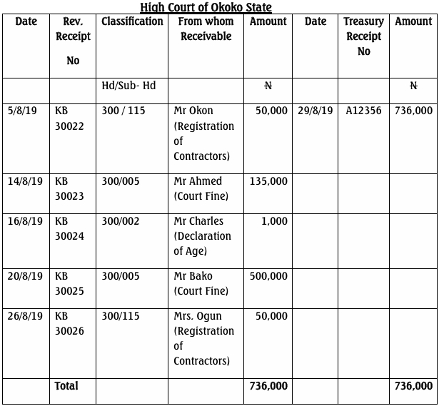 Mr. Dokun, a revenue collector in the High Court of Okoko State, submitted the following information for the month of August 2019: