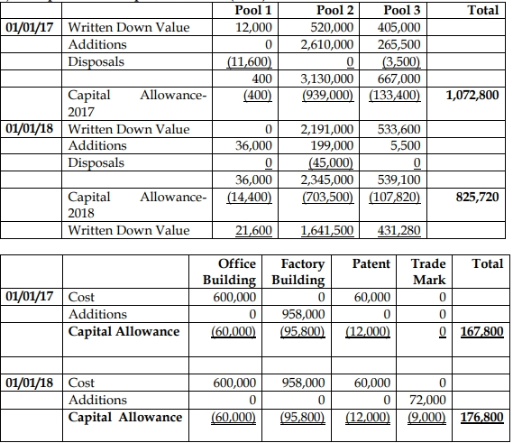 Fafana Manufacturing Company Ltd, producers of special fruit juice, started business on 01/01/2016 and prepares accounts to 31 December each year. The company had constructed an office building, which was put into use on 01/01/2016. The following are the capital allowance written down values brought forward from pools of assets as at 01/01/2017: