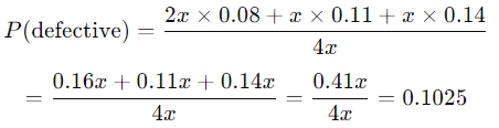 Let the number of components from process B be denoted as x. The number of components from A is 2x, and the number from C is also x. The total number of components is 4x. The total defective rate for the batch is calculated by finding the weighted sum of the defective rates from each process: