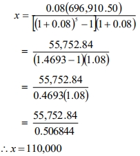 A lawyer plans to save a certain amount of money Nx per annum for 5 years on the first day of the year. If the interest rate is 8%, for him to receive N696,910.50, determine x. (10 Marks)