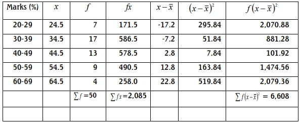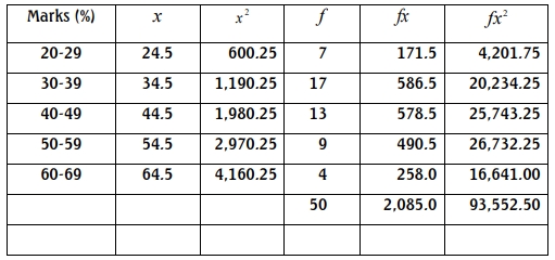 If the mean mark is 41.7%, calculate the mode and Pearson’s coefficient of skewness. (10 Marks)