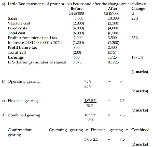 iv) Calculate the Combined gearing, measured as the ratio of the percentage change in total earnings (or EPS) to the percentage increase in sales. (2 marks)