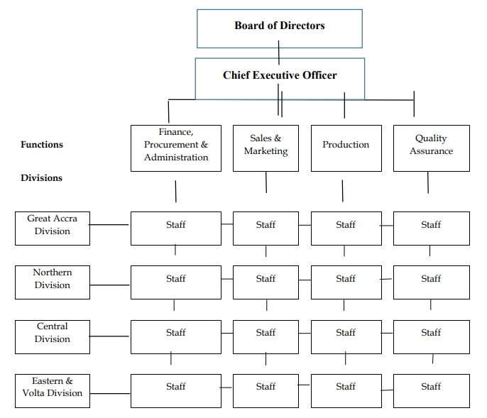 The new CEO is proposing the adoption of a new organisational structure to match the company’s growth. The new structure would have four centralised functional departments – Finance, Procurement & Administration; Sales & Marketing; Production; and Quality Assurance, coupled with four divisions based on geographical areas – Great Accra Division, Northern Division, Central Division, and Eastern & Volta Division.
