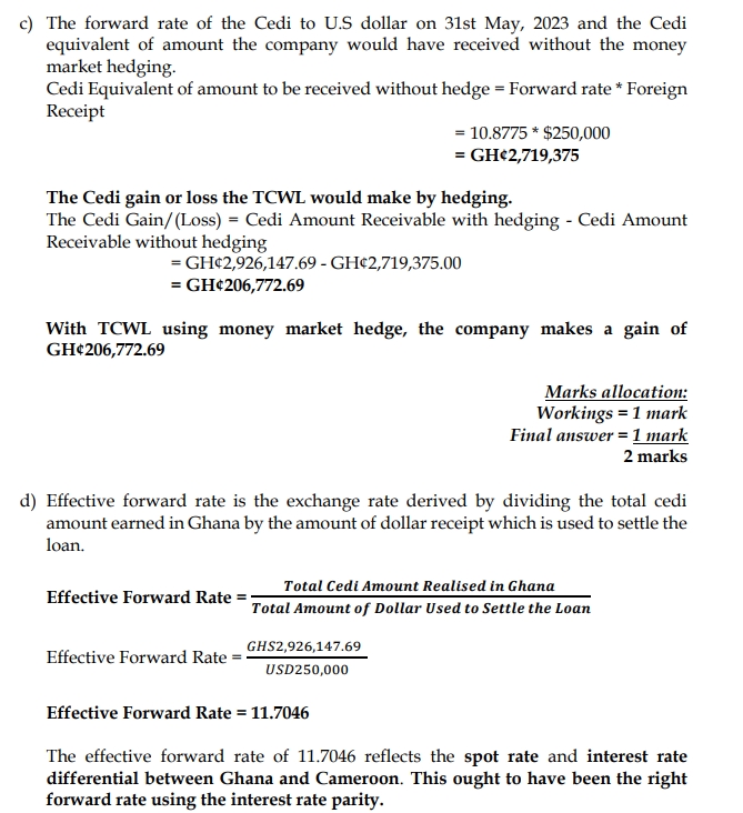 c) The Cedi gain or loss that TCWL would make by hedging. (2 marks)